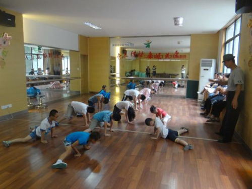 挹江门街道丁山社区2013年暑期青少年夏令营武术班7月22日开班。走进一楼活动室,在教练一声声有力的口令下,十多位少年儿童一字排开,出拳、推掌、钩手,马步、弓步、踢腿,一招一式学的有模有样,嘴里还发出“嗨、嗨”清脆响亮的喊声。小学员们认真模仿着教练的示范动作,其中,一位十岁小男生做的动作十分标准,一位五岁小女孩把劈叉、弯腰做的很到位,得到了教练和陪同家长们的连声赞叹。身着红、蓝色练功服的两位小师姐是武术班的班长,她们为弟弟、妹妹们做了精彩的武术表演,拳、剑、棍的套路对练,让小学员们大声叫好,一阵阵掌声从活动室飞出,在室外炎热的空气中回荡。从小培养孩子们对中华武术的了解与兴趣,为强身健体而学习武术,已经受到越来越多的孩子和家长们的欢迎。