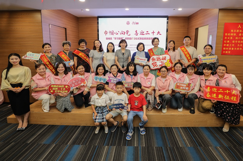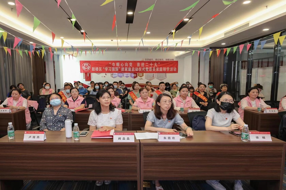为全面贯彻习近平总书记关于妇女和妇女工作的重要论述和“十四五”时期群团改革的重要指示精神,紧紧围绕迎接、宣传、贯彻党的二十大这条主线,加强妇女、家庭、儿童思想政治引领,积极培育和践行社会主义核心价值观,充分发挥妇女在弘扬中华民族家庭美德、树立家风方面的独特作用,充分发挥最美家庭和女性先进典型的示范引领作用,引导全区广大家庭学好用好“学习强国”平台,让党的创新理论飞入寻常百姓家。8月5日,在幕府山街道白云社区,鼓楼区妇联联合区委宣传部(区文明办)、区委区级机关工作委员会共同举办“巾帼心向党、喜迎二十大”鼓楼区“学习强国”进家庭启动仪式暨最美家庭领学活动。区妇联主席阙晶晶,区级机关工委副书记、妇工委主任卢陵燕,区妇联副主席周宏丽,幕府山街道工委副书记、妇联主席徐楠,区妇联副主席陈亚蕾,区委网信办副主任朱霞欢等领导出席活动,街道妇联副主席、学习强国进家庭宣讲员、妇联各级执委、最美家庭、五好家庭、三八红旗手、巾帼岗位明星、巾帼志愿者代表等60余人参加活动。