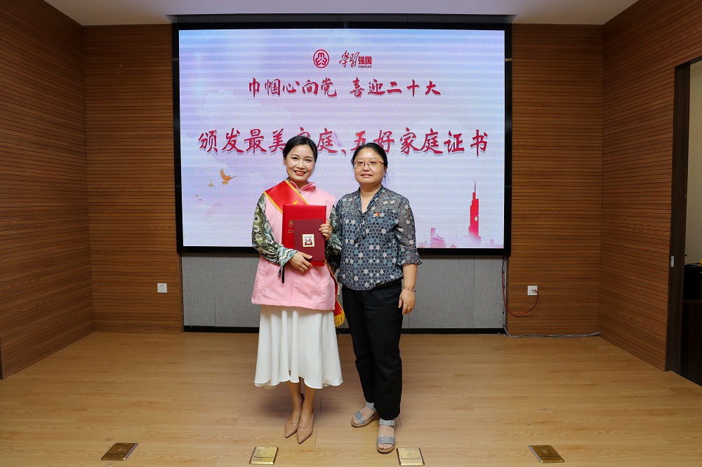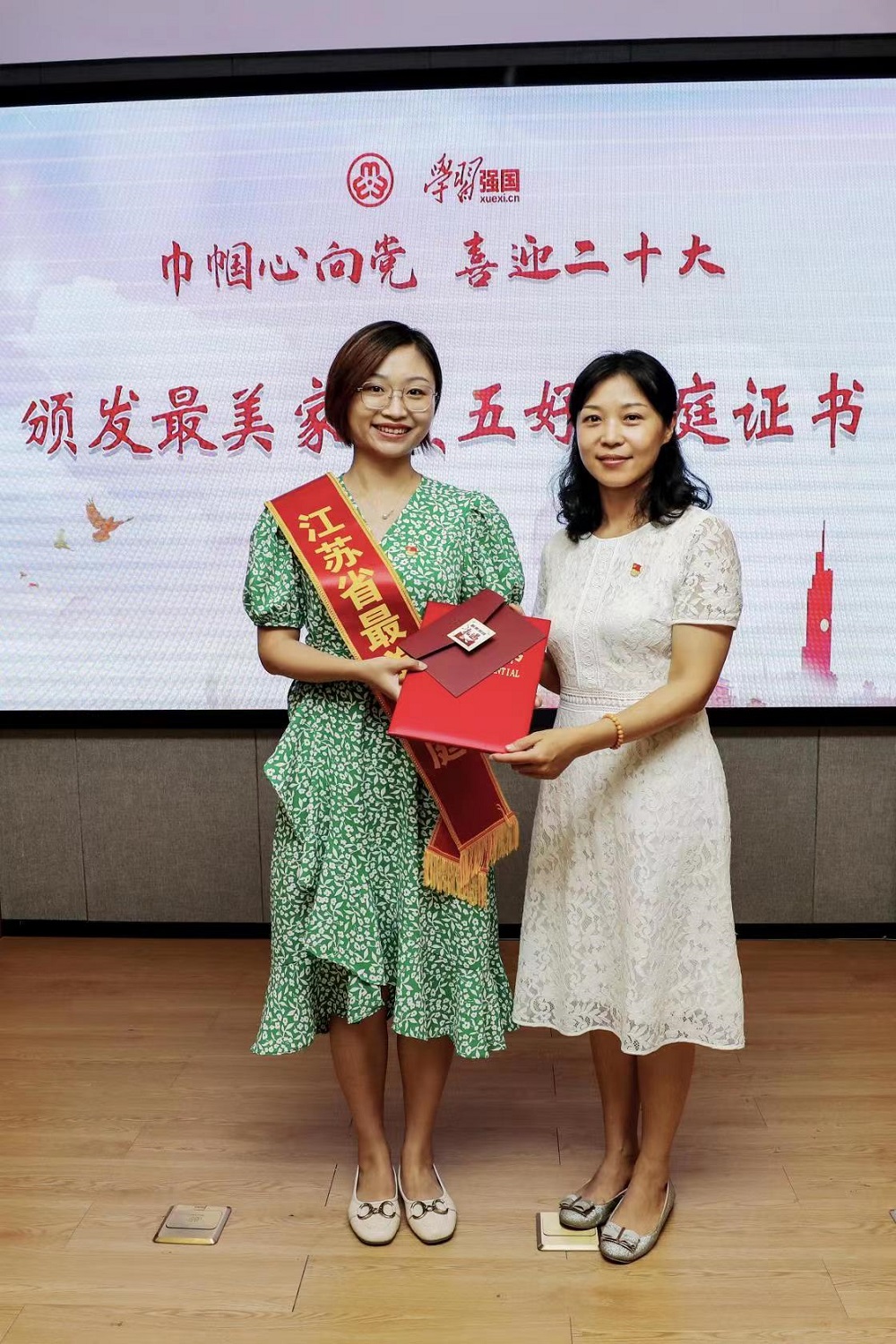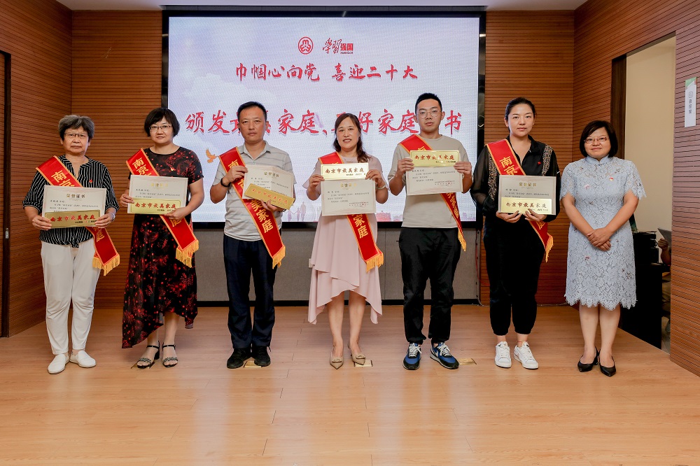 活动现场,为谢静、韩雪、王晓敏、屠晓艳、朱易、许鹤蘋等6户2022年南京市最美家庭,2022年江苏省五好家庭李易崇家庭等代表颁发证书,为来自幕府山街道白云社区的最美家庭代表赠送学习强国”能量包,激励他们积极引导身边家庭学好用好“学习强国”学习平台,让越来越多的身边人成为“学习强国”的“铁杆粉丝”,让学习赋能家庭,以学习助力发展。