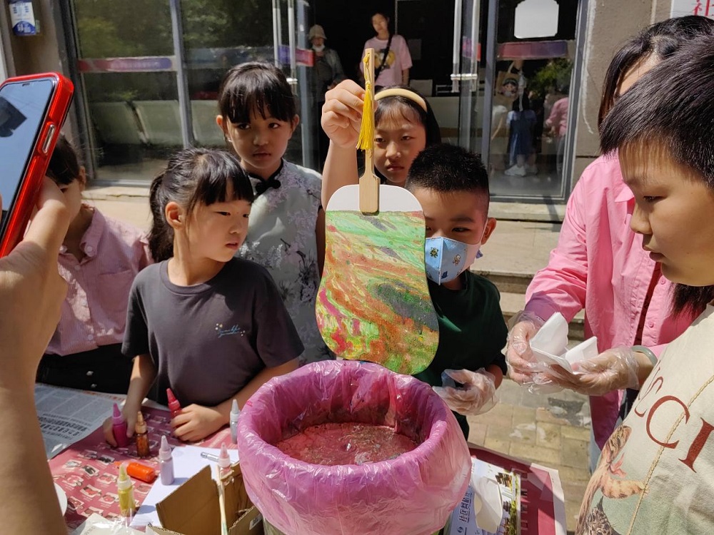 活动中,孩子们在陶老师的指导下,聚精会神地投入到漆扇制作中。他们精心挑选着漆液的颜色,在水面上轻轻绘制着图案,小心翼翼地用筷子拨动水面,抹着漆层。漆液在水面上流淌,形成一道道美丽的纹理,或清新淡雅,或艳丽夺目,制作出的作品是以漆为媒,以扇为纸,制作出无法预计之美的漆扇作品。