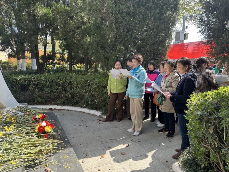 活动现场社区志愿者宣读文明祭扫倡议书,社区文艺队进行诗歌朗诵,随后走向公祭台,为已故的先烈和亲人献上鲜花,将自己对先烈和亲人的思念用手中的菊花来祭奠。