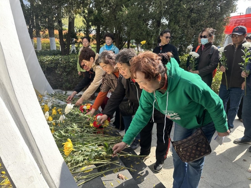 新河村社区30多名退休人员、党员和工作人员手持白菊,走进遇难同胞纪念碑,在烈士纪念碑前献上跨越时空的敬意,通过公祭活动让大家缅怀先烈和亲人、寄托哀思,并帮助和引导大家用文明、绿色、低碳的方式纪念先烈和逝去的亲人。